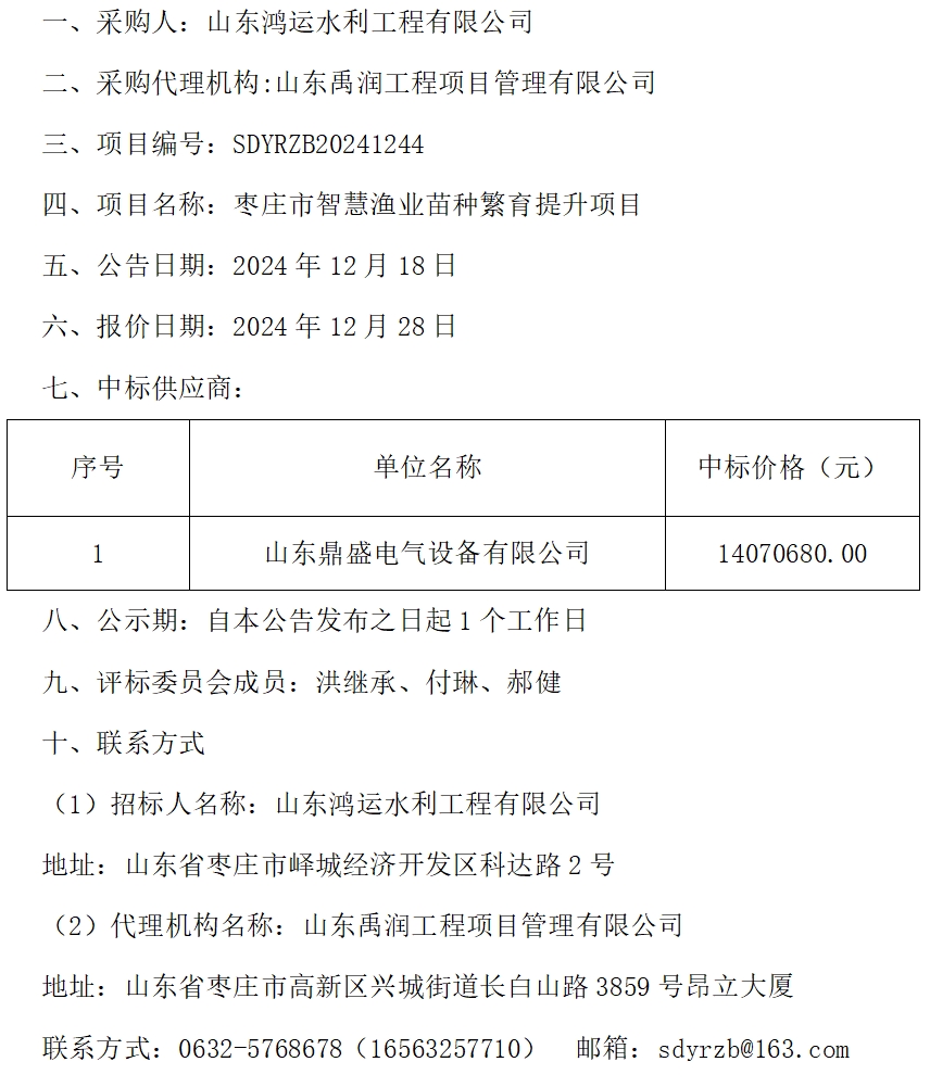 棗莊市智慧漁業苗種繁育提升項目中標公示