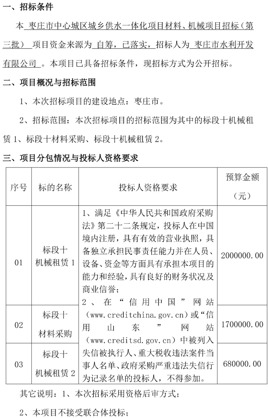 棗莊市中心城區城鄉供水一體化項目材料、機械項目招標(第三批)招標公告