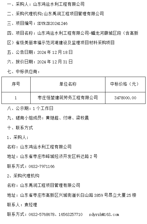 山東鴻運水利工程有限公司-蟠龍河薛城區段(含高新區)省級美麗幸福示范河湖建設及監理項目 材料采購項目成交公示