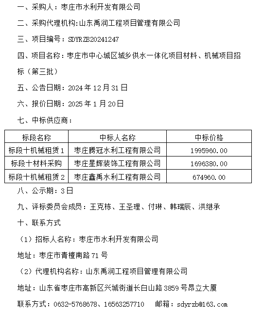 棗莊市中心城區城鄉供水一體化項目材料、機械項目招標(第三批)中標公示