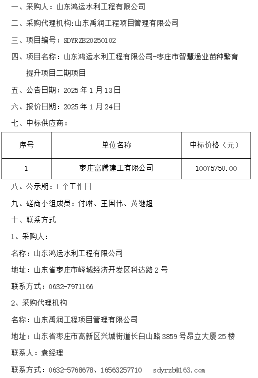 山東鴻運(yùn)水利工程有限公司-棗莊市智慧漁業(yè)苗種繁育提升項(xiàng)目二期項(xiàng)目成交公示