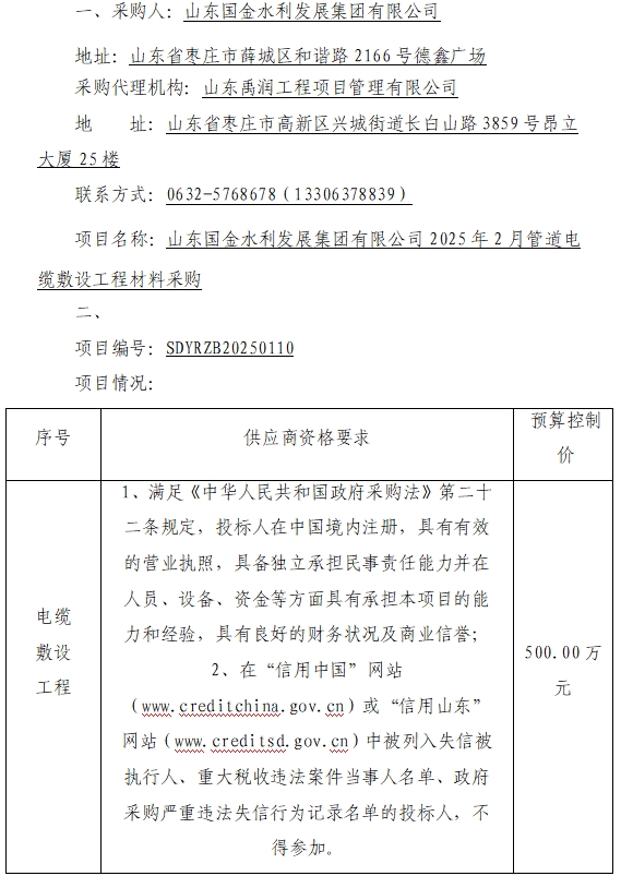山東國金水利發展集團有限公司2025年2月管道電纜敷設工程材料采購競爭性磋商公告