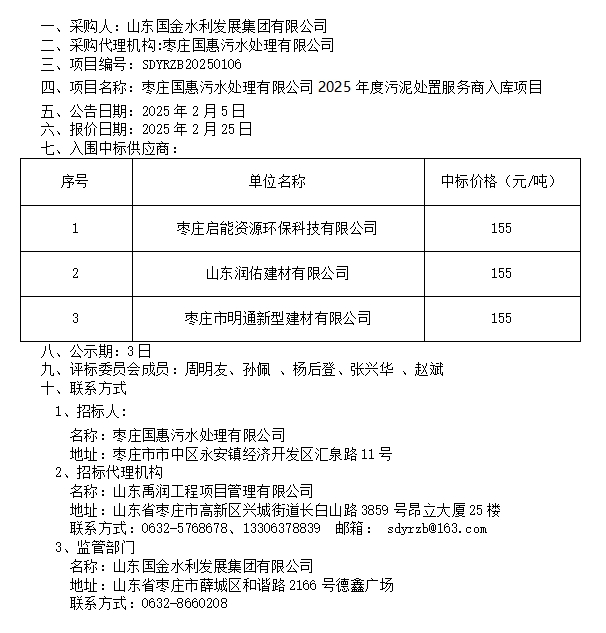 棗莊國惠污水處理有限公司2025年度污泥處置服務商入庫項目 中標公示